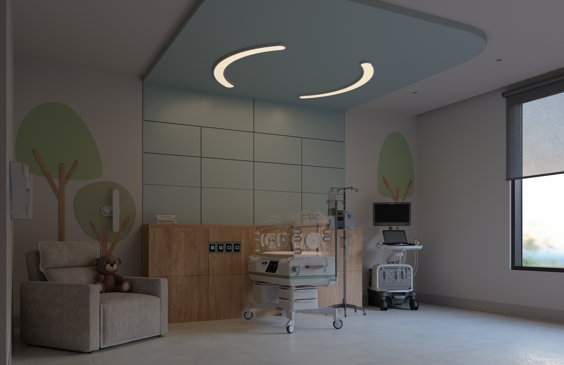 - Modes: ambient, exam, night observation, and an optional reading light